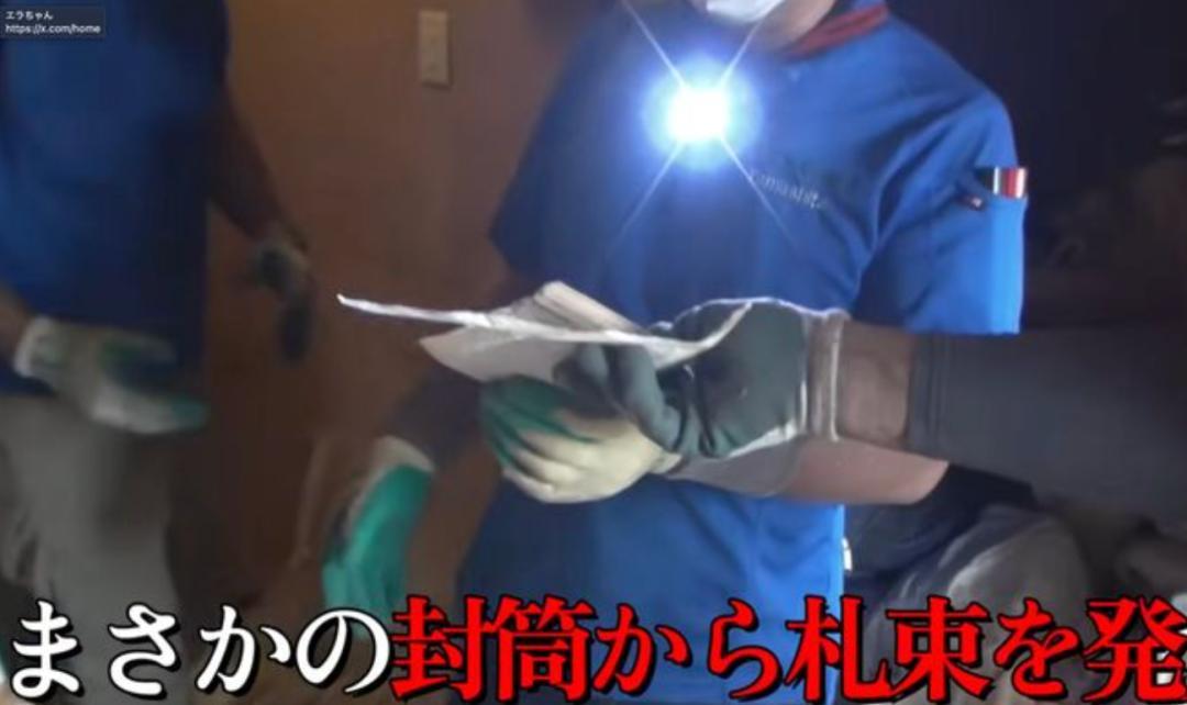 工作人员穿过垃圾遍地的恶臭房间,最后却无意间在地上的一个信封里找到了一沓厚厚的钞票。